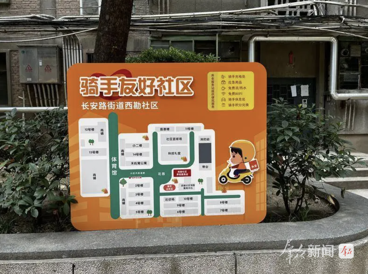 平衡点从细节做起。小区入口竖起“限速5公里”标识,主干道加装6盏路灯,墙上张贴“减速慢行”提示,用看得见的规矩引导骑手文明骑行。社区办公楼旁还划出方便骑手临时停放的专用停车区。最让骑手们叫好的是门口那张平面导引图,每栋楼、每个单元标注得清清楚楚,进门一看便知。