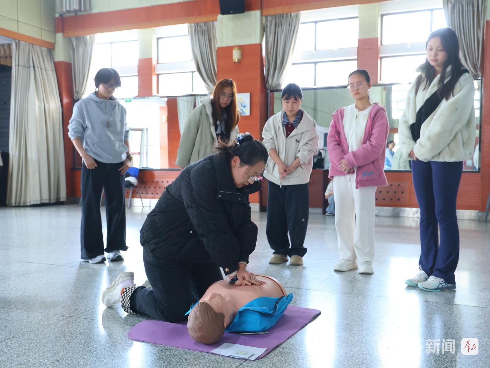 “记住一个‘剪刀石头布’的口诀。”党静雯一边说,一边拿起模拟人示范动作要领:“‘剪刀’是两指并拢放于肚脐上方两横指处,‘石头’是握拳置于手指上方,‘布’是用另一只手包住拳头,快速向内、向上冲击腹部,直到异物排出。如果梗阻仍未解除,应立即拨打120。”同学们聚精会神地听着,纷纷举起手机记录关键步骤。