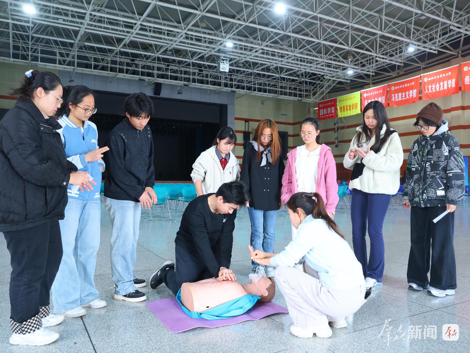 作为全国急救教育试点单位,该校将急救技能培训融入新生军训大课体系,设立“急救学分”政策,成立曹德旺爱心社应急救护队社团,鼓励学生成为第一施救者,让更多青年学子参与到学习急救知识的行列中来。