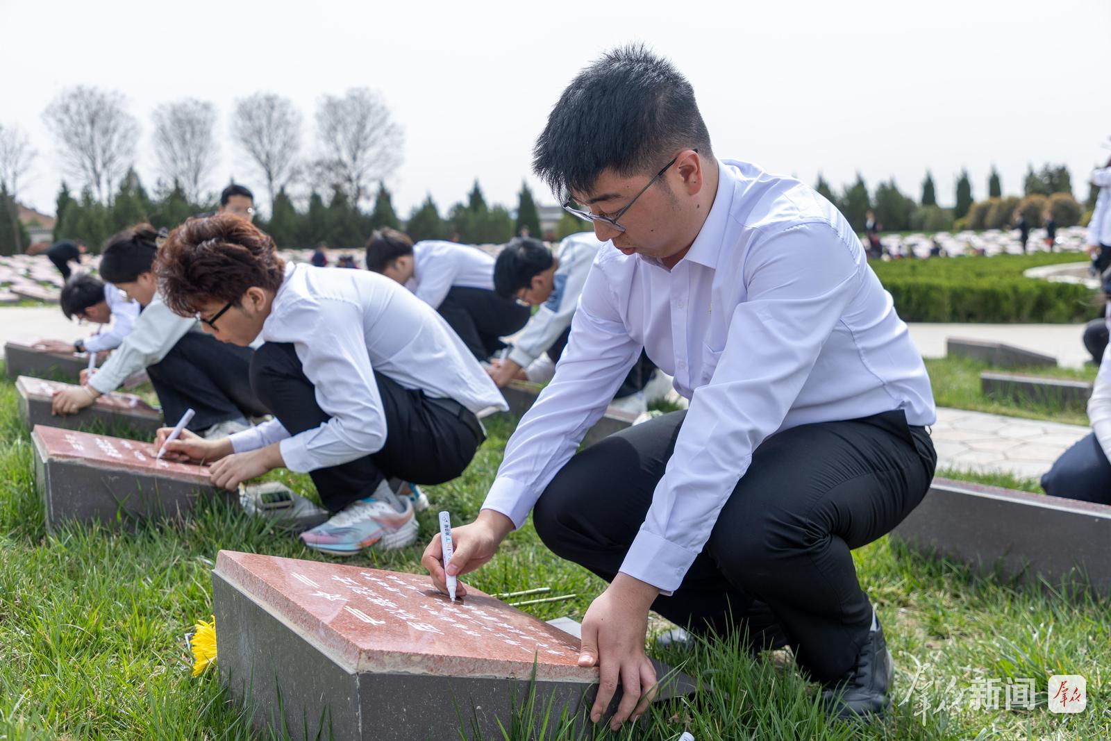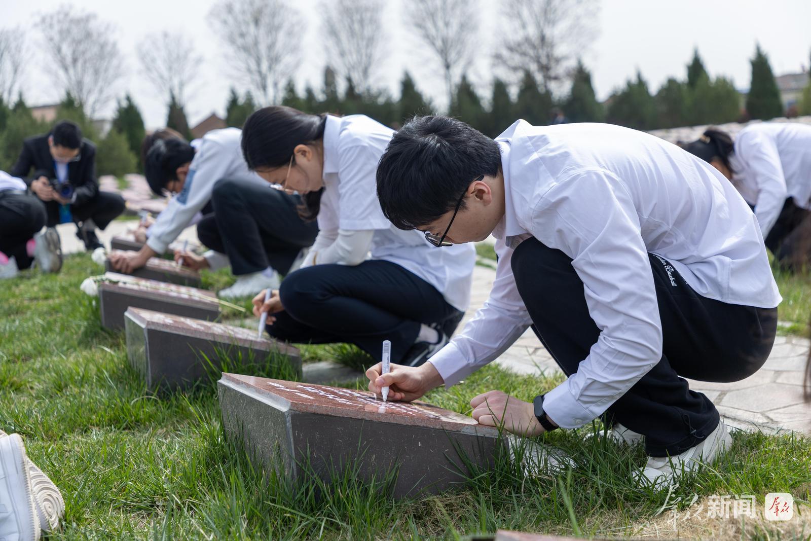 学生党员孙芙芸屏住呼吸,单膝跪在一方烈士墓碑前,轻轻拂去碑上的灰尘,小心翼翼地为墓碑主人的姓名填上新漆。在她身后,百余名来自西北农林科技大学的学生党员、入党积极分子和青年代表握笔、填漆,为陵园内2160座烈士墓碑描红填金,向革命先烈献上最诚挚的敬意。