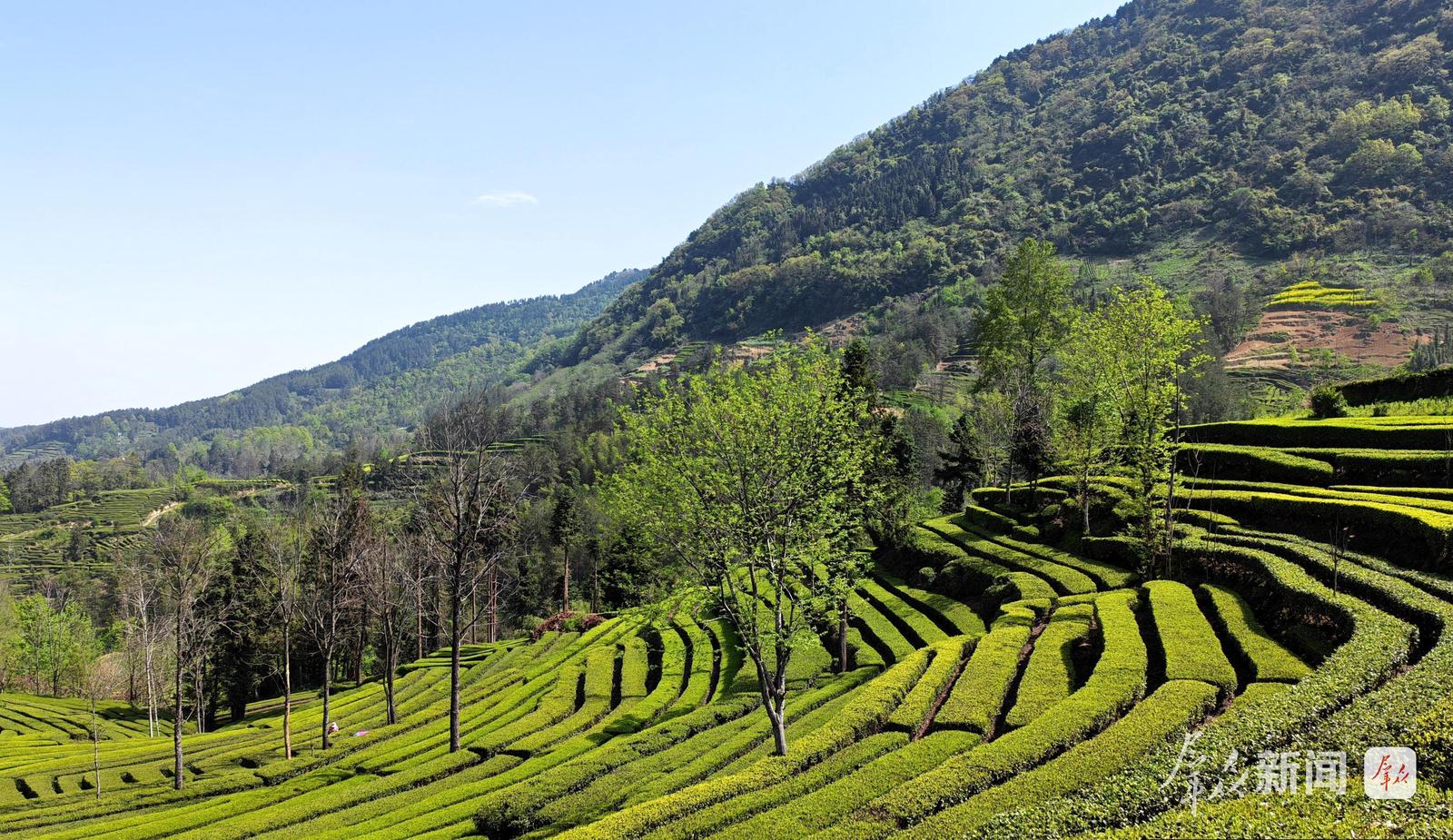 4月5日清明假期,汉中市南郑区牟家坝镇柳沟生态茶园迎来春日最美时节,千亩茶园郁郁葱葱,层层叠叠的茶垄顺着山势绵延起伏,翠绿的茶芽长满枝头,一派生机盎然的喜人景象,吸引众多游客前来踏青赏景、体验采茶。山间游人络绎不绝,热闹非凡。