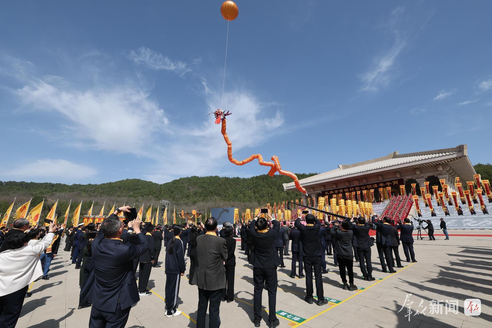 乐舞告祭以文化脉络为线、艺术表达为形,举手投足间诠释着“大礼至简、大美有态”的东方哲学,将黄帝文化与民族精神生动呈现于来宾面前。在盛大的乐舞告祭中,一条56米长的中华飞龙自祭台中心盘旋腾跃而起,在阳光下熠熠生辉,形成“始祖迎灵”和“龙驭桥山”文化意义上的前后呼应,象征着56个民族如巨龙般凝心聚力、腾飞向上,实现了历史文化与时代精神的完美交融。