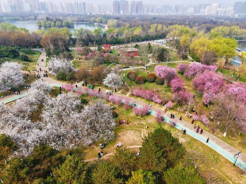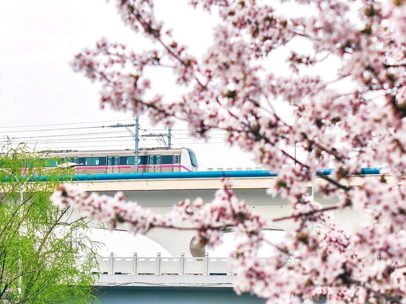 地铁在桃花与紫叶李的花海间画出灵动弧线