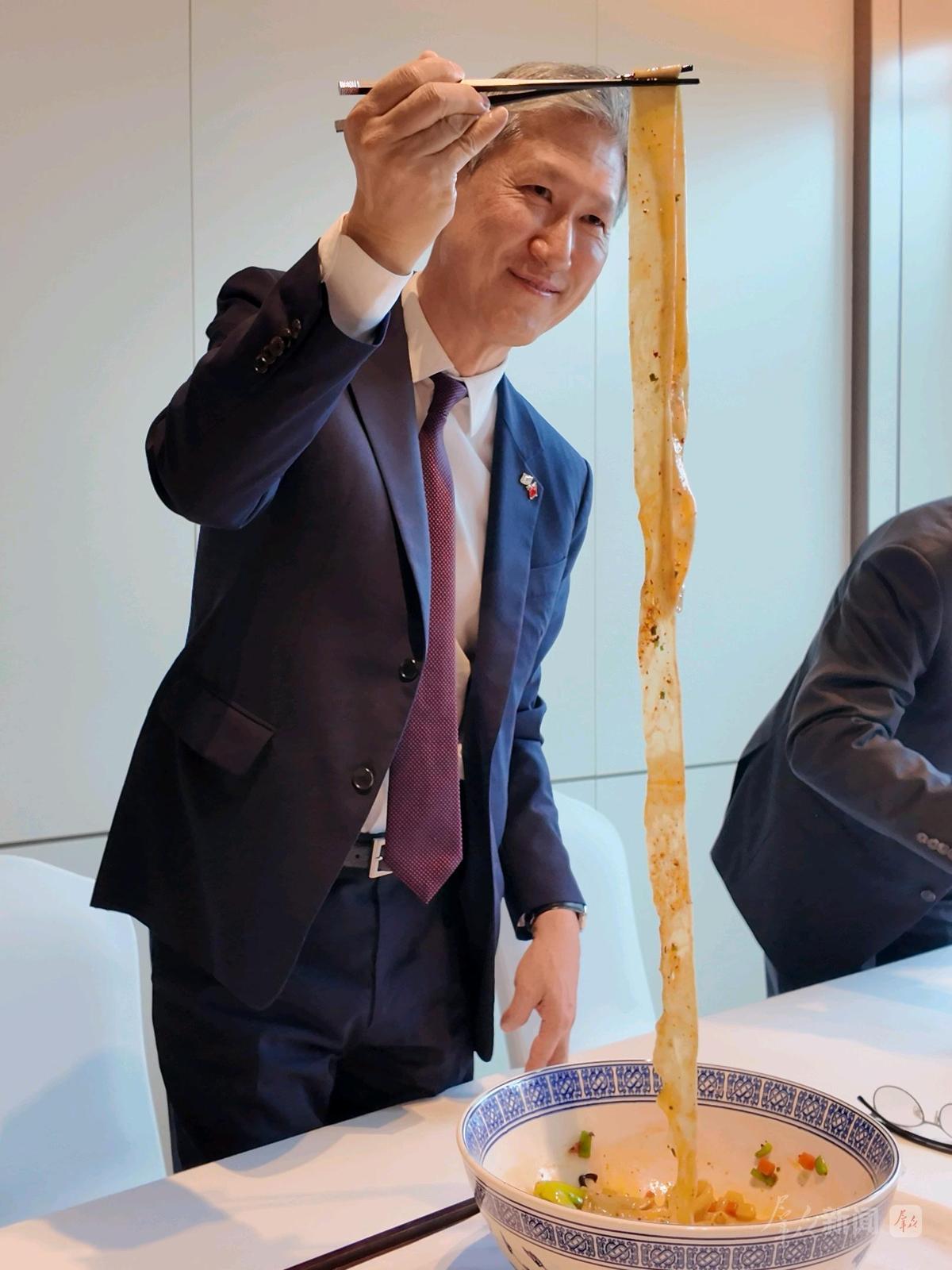 4月9日,韩国驻华大使卢载宪到访陕西,提笔书写复杂的“biang”字,品尝地道biangbiang面,直言这是“吃过最好吃的面”。他表示,“biang”这一陕西独特的文化符号,可打造为全新的文化名片。