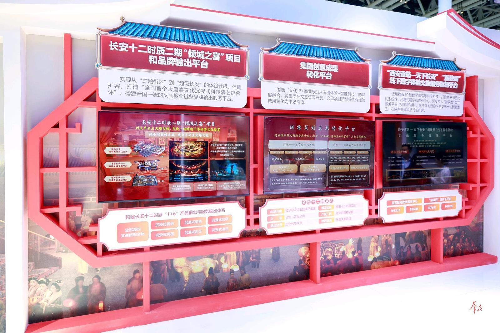 长安十二时辰项目品牌价值得到不断释放和凸显。二期项目“倾城之喜”令人期待,备受各地客商关注。上海长安三万里项目、杭州·临安十二时辰、武汉国色芳华项目、广州长安的荔枝项目等作为“长安十二时辰”品牌输出项目正在全国多个一线城市加速落地。集团创意成果转化平台展示了如梦令宋词主题演艺乐园等品牌输出成果。“西安首站—天下长安”“游陕西”线下数字体验文旅服务枢纽平台展示了裸眼3D和数字微缩等前沿科技,打造沉浸式科技新体验。