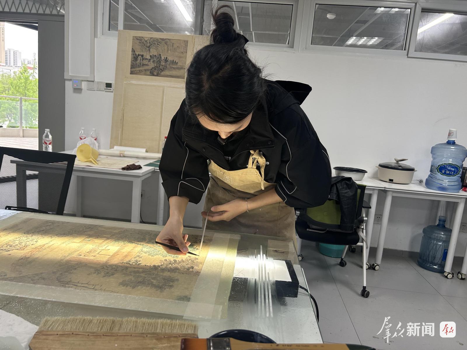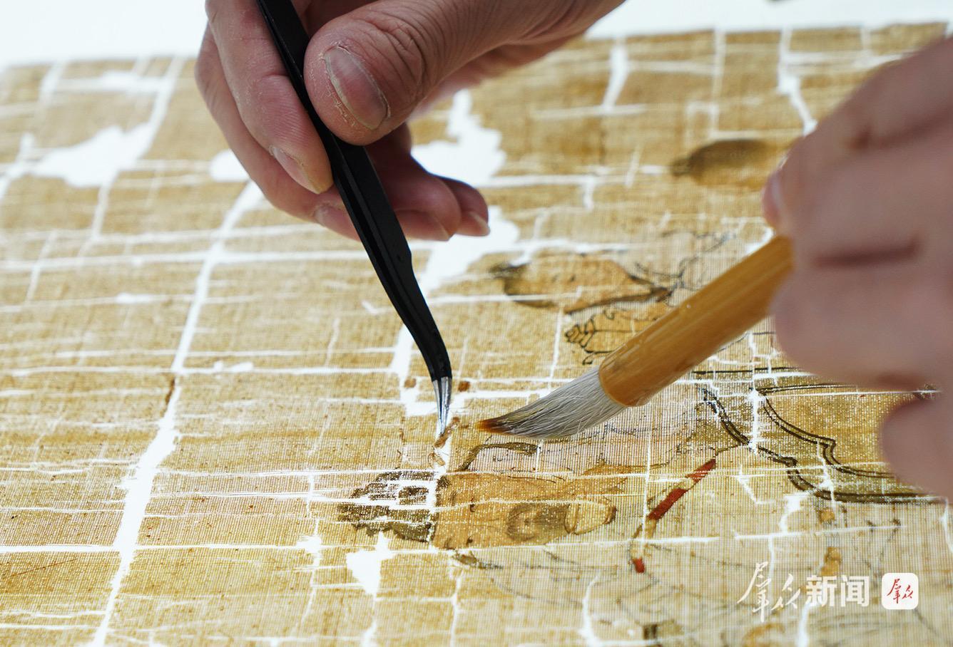 “修复有断裂风险的纸张时,需要用细细的折条加固,折条也是多层纸张做的,用手工裁剪,单裁纸这项基本功,我花了3个多月练习。”在团队位于西安工业大学的工作室,高兴细心地修复一幅古画,她一边用镊子轻压折条,一边轻声说道。