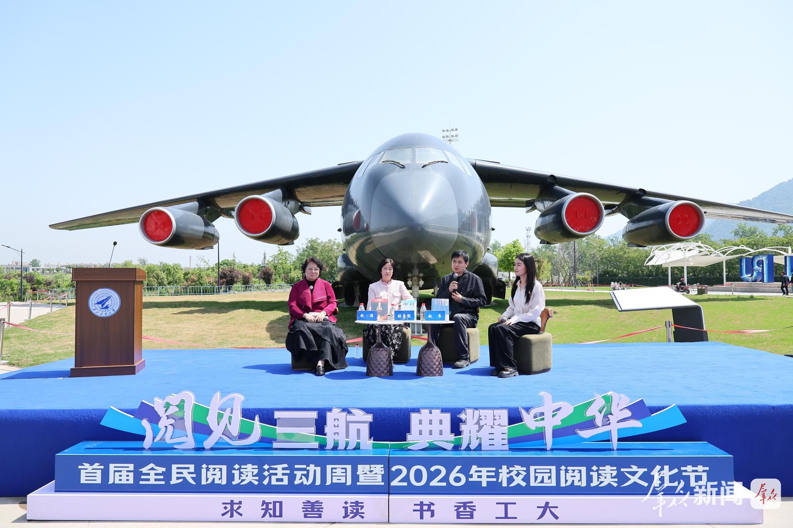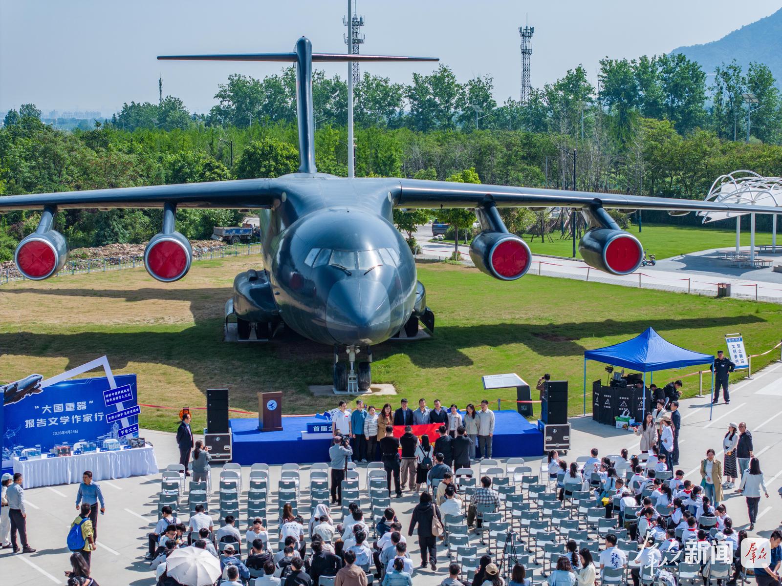 4月23日,第31个“世界读书日”,西北工业大学校园内,一场连接科技与文学的精神盛宴——“大国重器”报告文学作家行活动在该校军工素质教育实践中心外场运-20“鲲鹏”大型运输机旁举行。本次活动由西北工业大学出版社、图书馆联合主办,旨在以报告文学为桥梁,挖掘“三航”(航空、航天、航海)科技文化内涵,推动全民阅读深入校园。来自省内大中小学的200多名学生参加活动。
